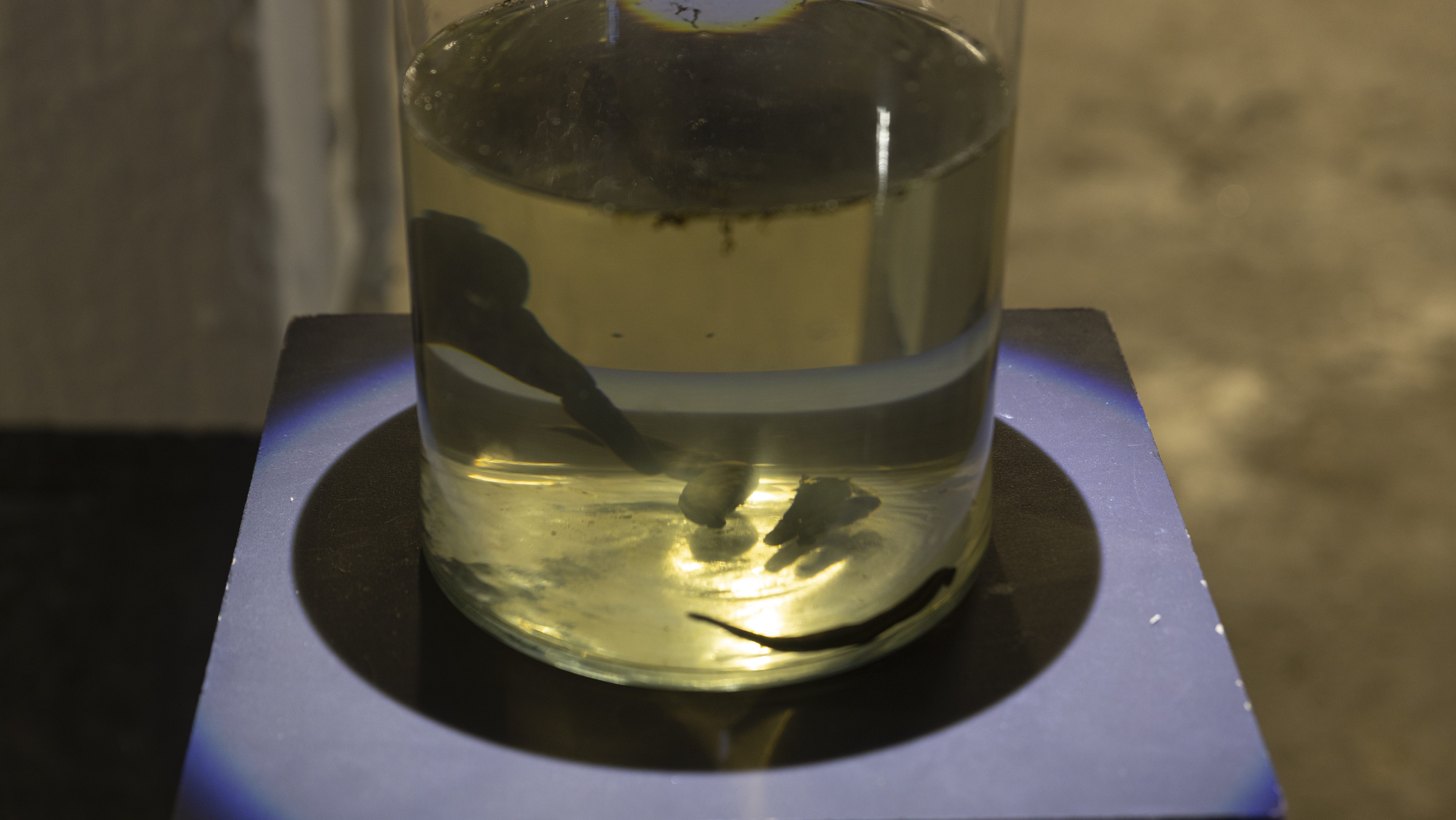 Located inside an abandoned car-paint shop, Five-Headed Worm contains a variety of works, reaching from photography and sculpture, to video, sound, installations and a sort of readymade in the form of five live leeches.