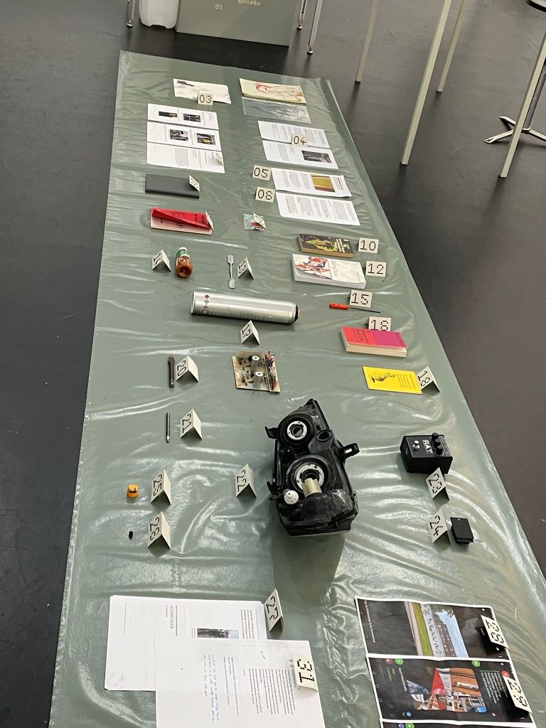 Anton Riebe, der Kurator der Ausstellung, sammelte von den Künstler*innen je drei Kartons mit von ihnen ausgewählten Objekten ein. Ausserdem stellte er ihnen eine günstige Digitalkamera und ein Tonaufnahmegerät zur Verfügung. Dazu wurden noch eine „Uniform“ der Künstler*innen ausgestellt, und eine fertige Arbeit, welche jedoch in Plastik eingepackt wurde.