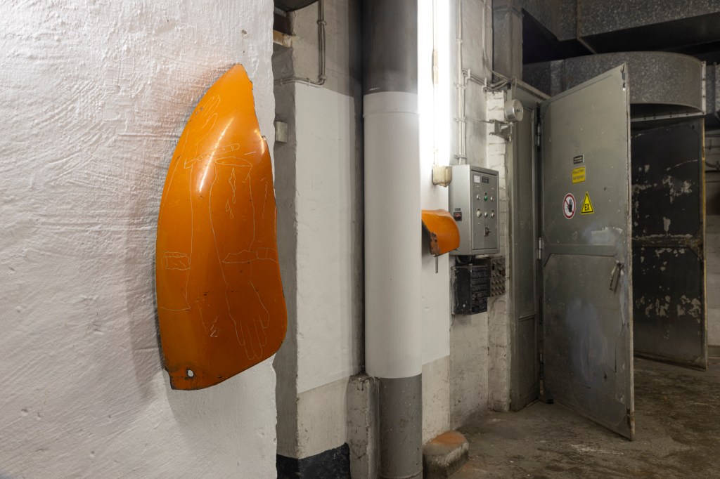 Ein brennendes, steinernes Haus neben einer komplizierten Lüftungsanlage (inspiriert durch die Räumlichkeiten der Ausstellung „Five-Headed Worm“); Die moderne Perfektion kann nichts tun um dem Alten, vermeintlich unzerstörbarem, den Zerfall zu ersparen. Sie teilen ein unumgängliches Schicksal.
